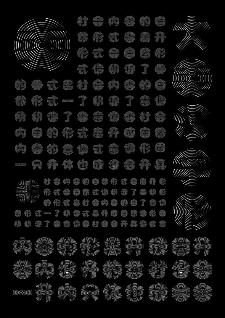 设计说明:在通常的汉字系统里面,单个简体汉字缺少时间的概念。例如一个名字无法显示时间的概念。亦然,通常简体汉字也无法表达。以年轮为器,承以时间的概念。于此,结合年轮特点“圈数”再融合“汉字”;弥补时间的缺失,结合汉字的具体达成具象的目的。希望这款字体既可以留住时间的同时也能留住具体的内容。