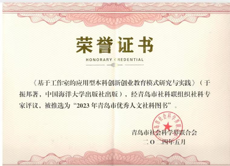 近期,创新创业教育学院收到青岛市社会科学界联合会下发的荣誉证书,冰球官网于振邦老师撰写的《基于工作室的应用型本科创新创业教育模式研究与实践》和《中国文化游习视域下的应用型卓越人才培养实践研究》两部著作获得社科专家一致好评,均入选“2023年青岛市优秀人文社科图书”。