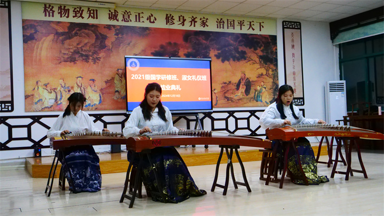 国学院名誉院长于善懃、副院长张维霖和多名任课教师共同出席见证属于21级国学院学子的特殊时刻。结业典礼在汇报演出中拉开帷幕,京剧联唱、古筝表演,在国学院教师的精心培育下,国学院特色班的学子们自信而大方的展示着一身才艺。