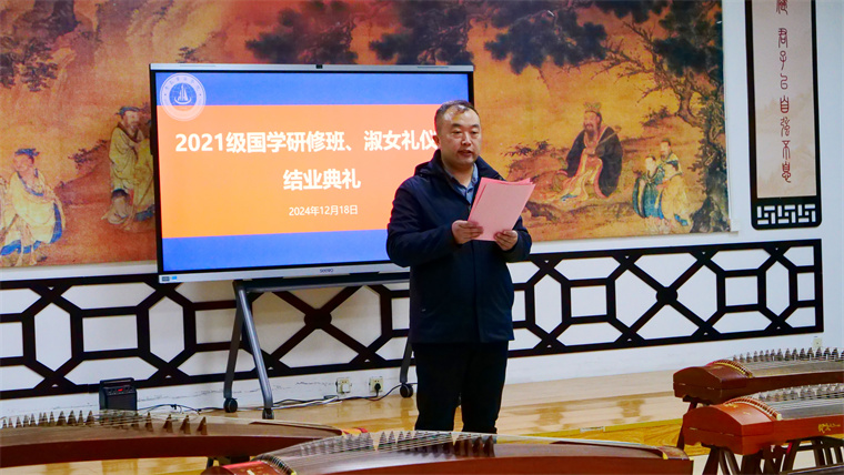 张维霖代表国学院全体教职员工,向同学们顺利结业表示热烈祝贺。他深情嘱托结业学子:“结业不是结束,而是另一个开始。在未来的旅途中,愿你们以诗教的情怀,礼教的风范,乐教的和谐,去影响和改变这个世界。”随后,张维霖宣读结业名单和表彰决定,于善懃与张维霖共同为结业学子颁发结业证书。