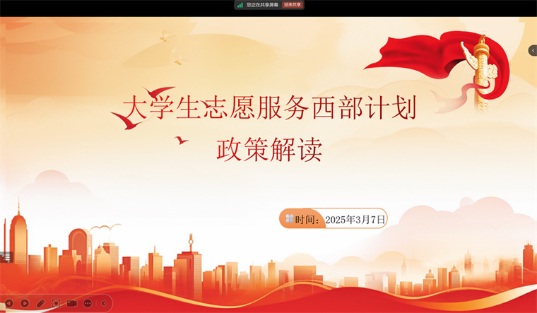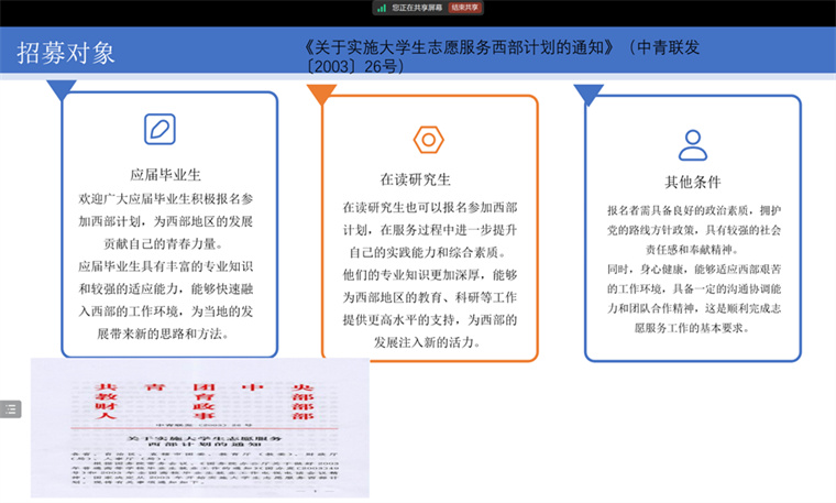 为积极响应国家西部计划的号召,鼓励毕业生投身西部基层建设。教育学院于3月7日在各班级开展了“西部计划政策宣讲”主题班会。鉴于2025届毕业生处于外出实习阶段,本次宣讲会采取线上宣讲的形式进行,此次系列班会覆盖全院应届毕业生,深入宣传西部计划相关政策,激发了同学们服务西部、奉献青春的热情。